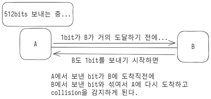그리고 만약 first half of slot time에 collision이 일어난다면, 이 collision은 sender가 slot time (first 512 bits times) 동안 sense할 수 있다.
