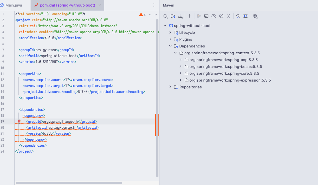 요런식으로 spring-context library를 설치하면 종속성으로 aop, beans, core, expression이 딸려 옵니다.